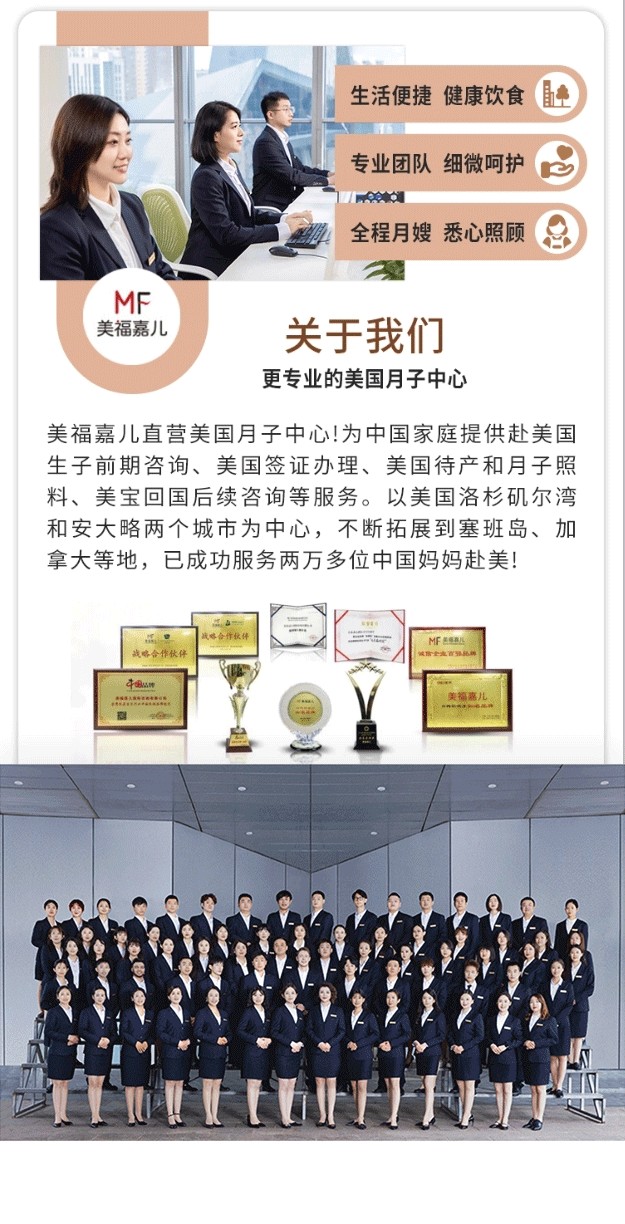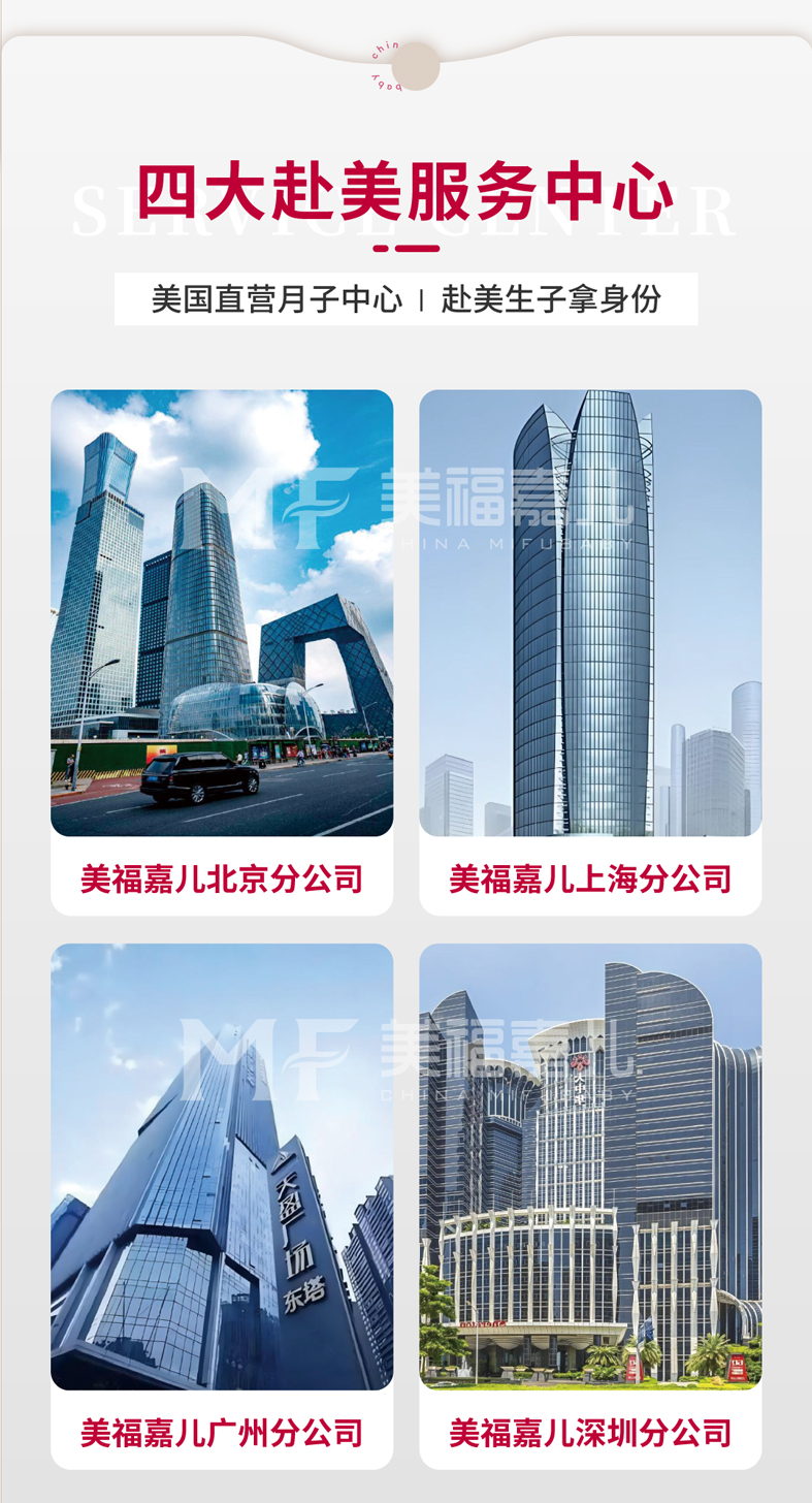 美福嘉儿,在北京、上海、广州、深圳核心商圈均设有直营分公司,拥有千余平方米5A甲级写字楼,设有13个专业职能部门,服务团队数百名,已成为赴美/赴加生子行业规模化、规范化口碑影响力行业标杆,占据大部分赴美/赴加生子市场份额。 美福嘉儿专注赴美/赴加生子咨询服务!为中国家庭提供赴美/赴加生子前期咨询、美国/加拿大签证办理、美国/加拿大待产、美宝/加宝回国后续服务等咨询服务,已成功服务数千名中国妈妈赴美/赴加生子。